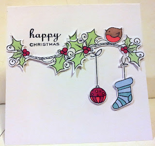 Have used my new Christmas Robins set, stamped the holly branch twice and the little robin, bauble and stocking in black Memento, coloured with Promarkers, cut them out and assembled.