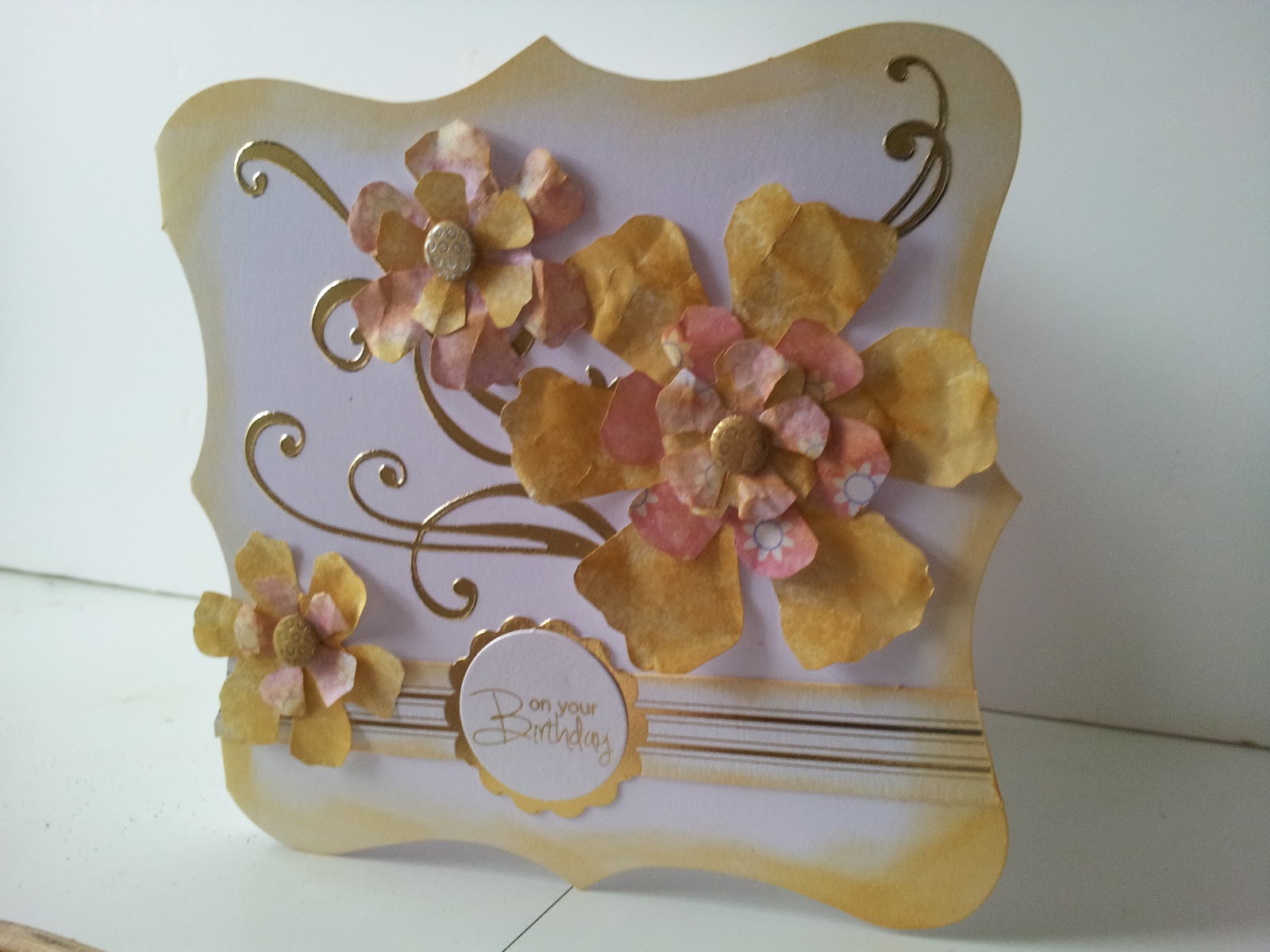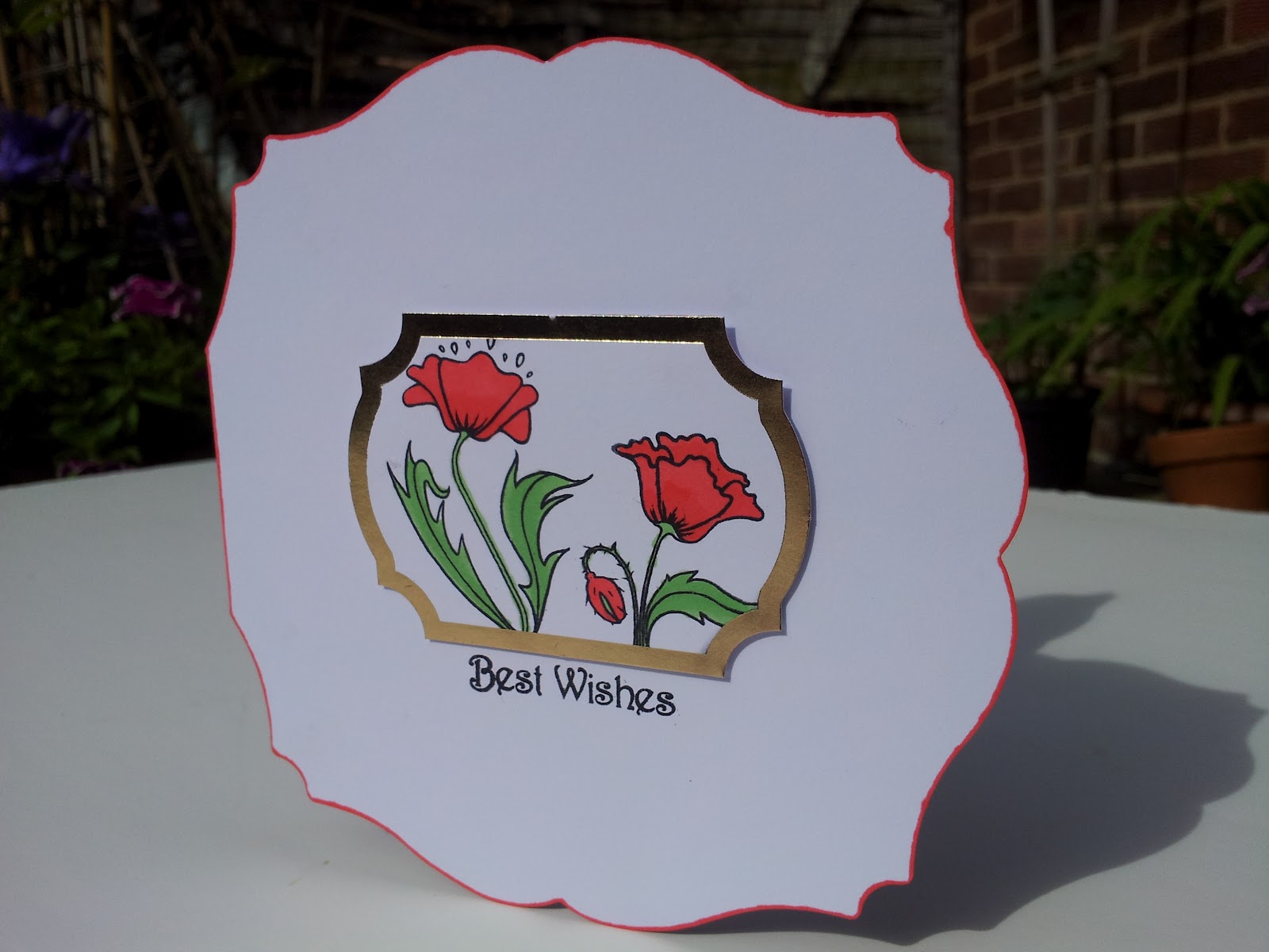 I cut a piece of white card a little smaller than my card blank, added Tim Holtz Distress Inks using some Cut and Dry foam, stamped and cut an aperture. Then added some colour and more stamping onto the card blank and mounted the frame over the card with Pinflair Glue Gel.