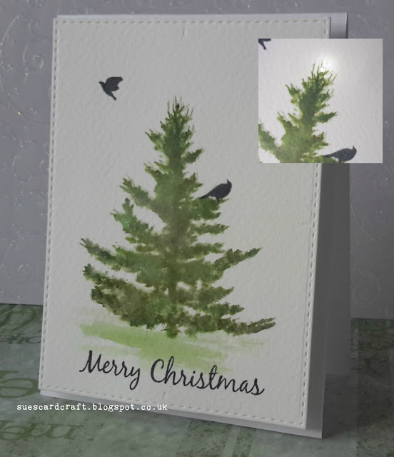 The tree stamp was inked with distress markers misted with water a few times in different shades of green and highlighted with Wink of Stella. When the sentiment is pressed, the top of the tree lights up (inset photo). It's a pity the sparkle and the light don't show up very well in the photo.