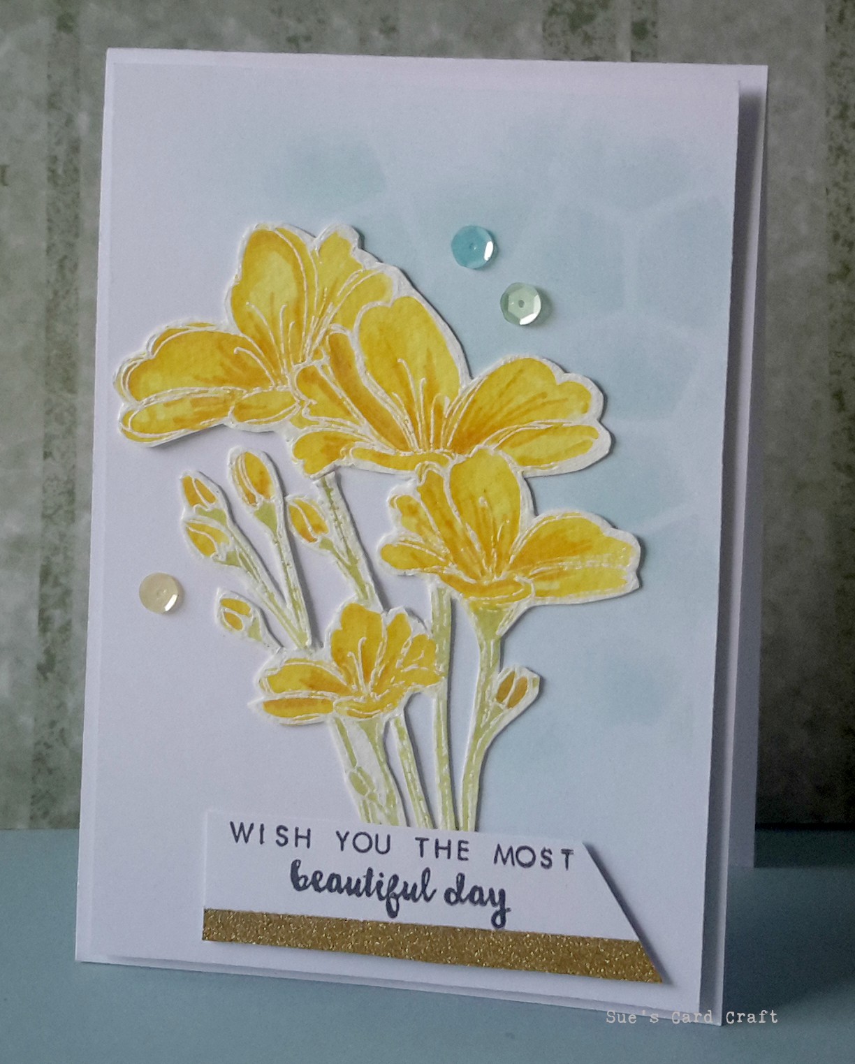 I heat embossed the flowers and sentiment in Altenew platinum embossing powder and water-coloured. Used the sprays to make a little background.