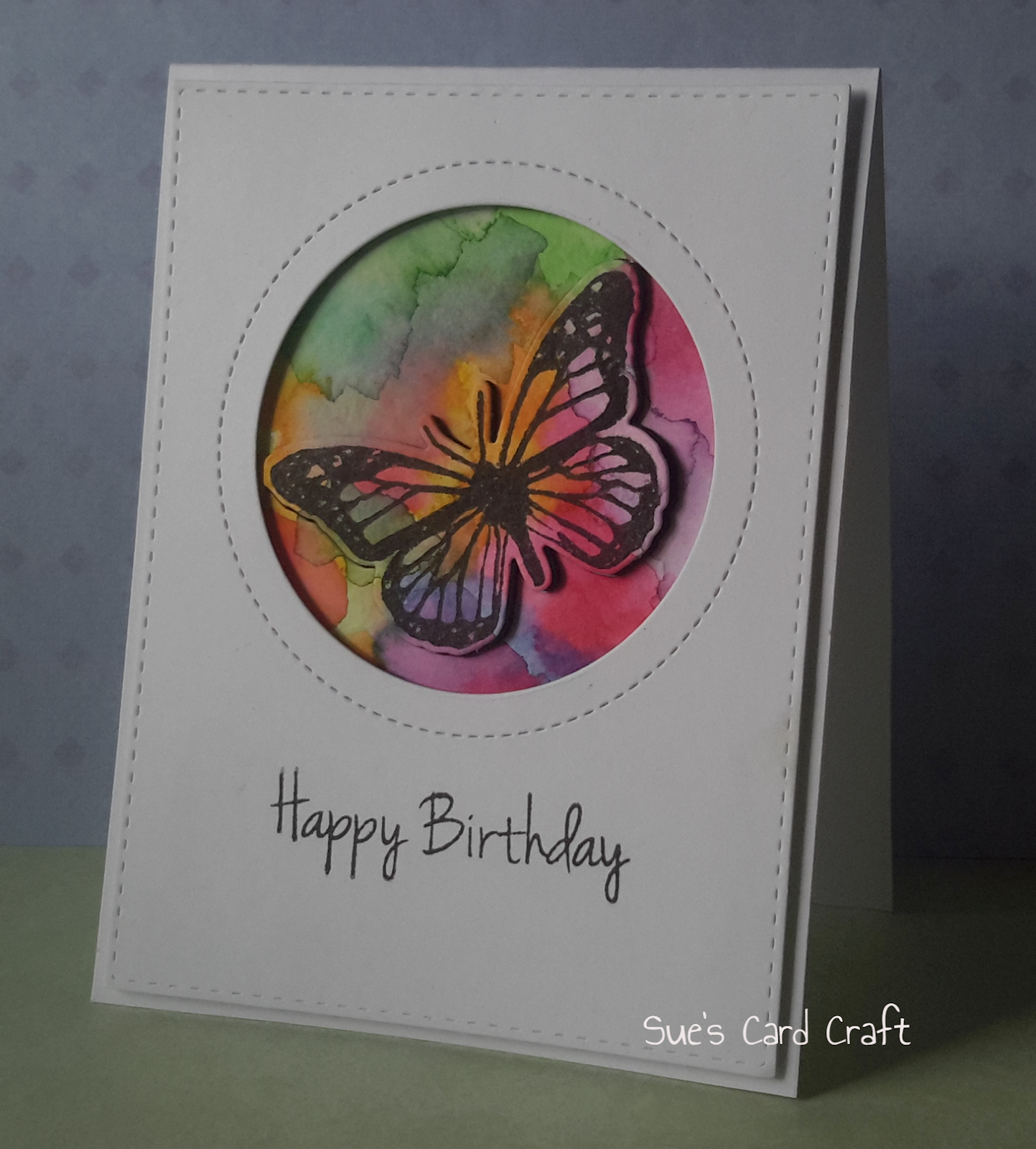 I stamped the Happy Little Stampers butterfly onto a watercolour background, cut it out with the matching die and popped it up on black foam.