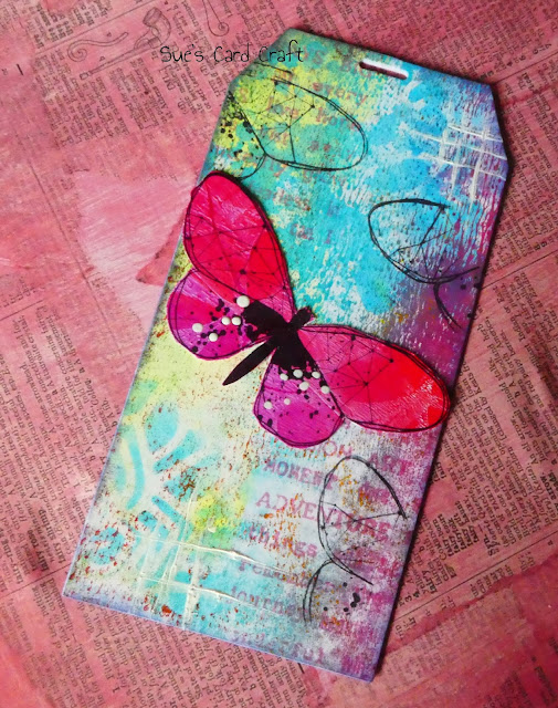 The background is acrylic paints. I used the sentiment stamps and butterfly to stamp over. The butterfly was stamped onto a gel print and fussy cut. Also added some stenciling to the background with a STAMPlorations stencil (tag also by STAMPlorations).